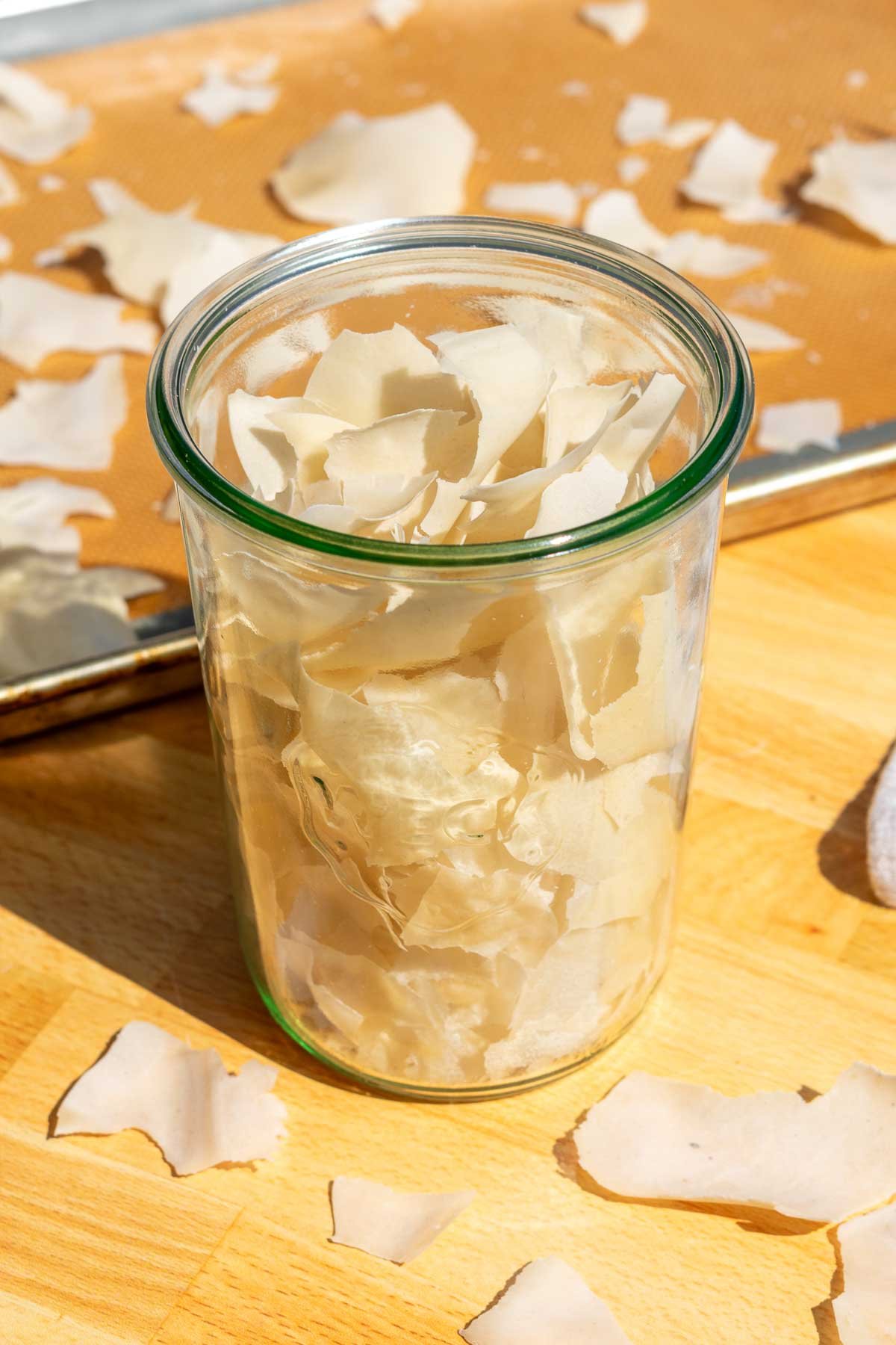 Once your starter is completely dry and brittle, break it apart into small flakes. Then, store it in an airtight container like a mason jar, another glass jar with a lid, or ziplock bag at room temperature in your pantry.