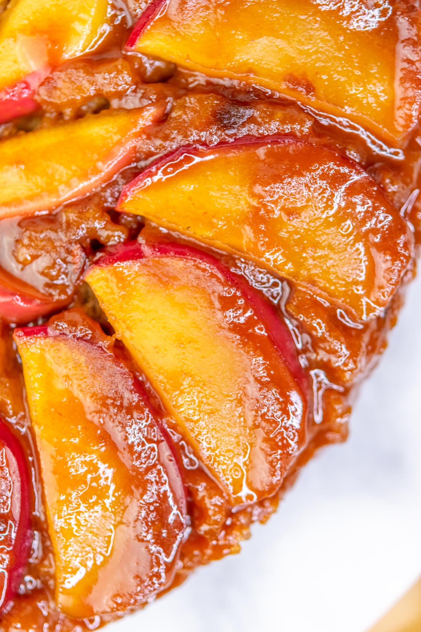 Unfortunately, this upside-down cake isn’t the best cake for freezing as the apples will turn brown quickly and the cake will lose some of its texture.