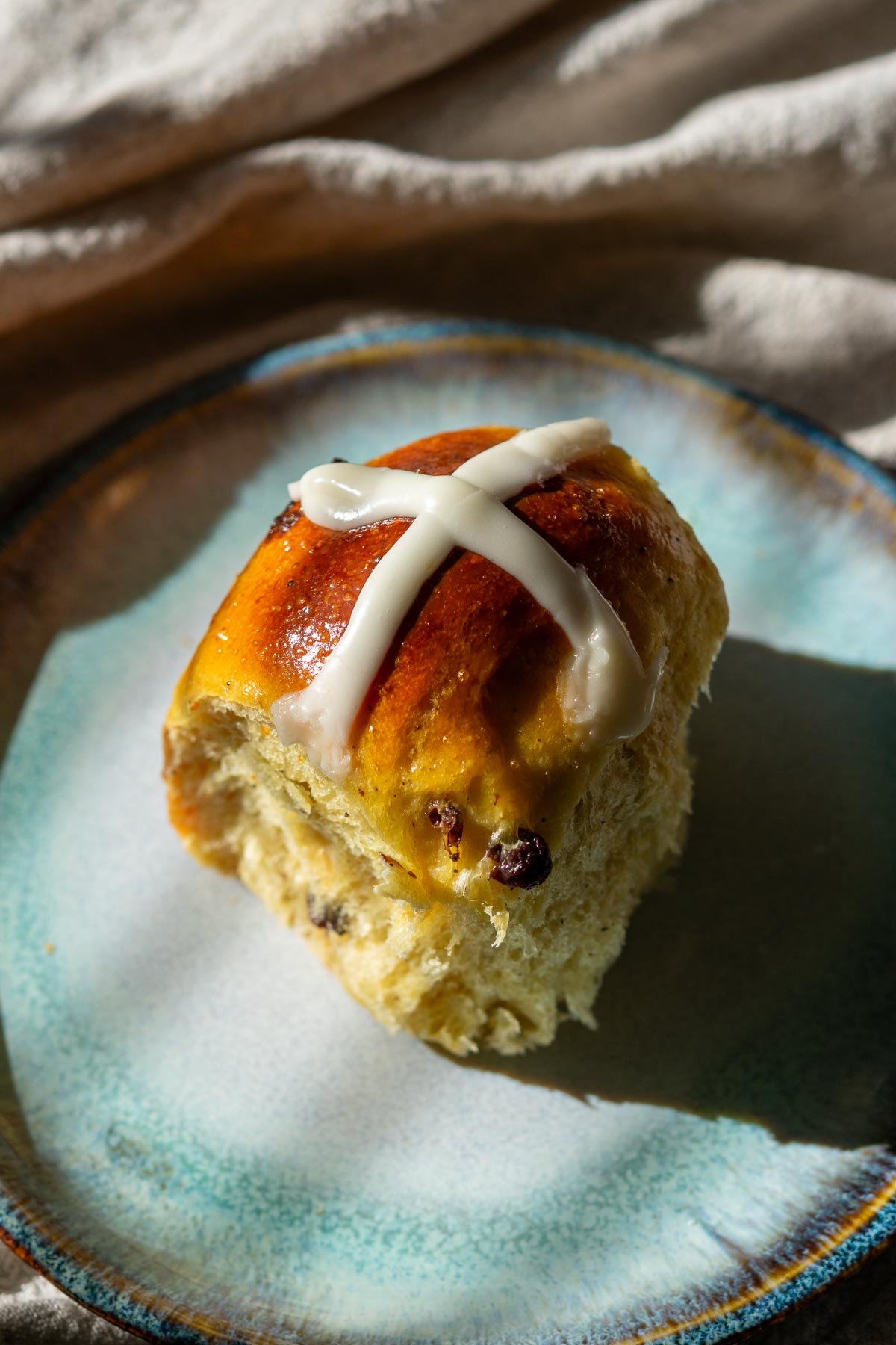 They’re slightly denser than my Sourdough Dinner Rolls or Sourdough Sweet Potato Dinner Rolls, but hot cross buns are typically not as soft as other brioche-style buns due to the added inclusions.