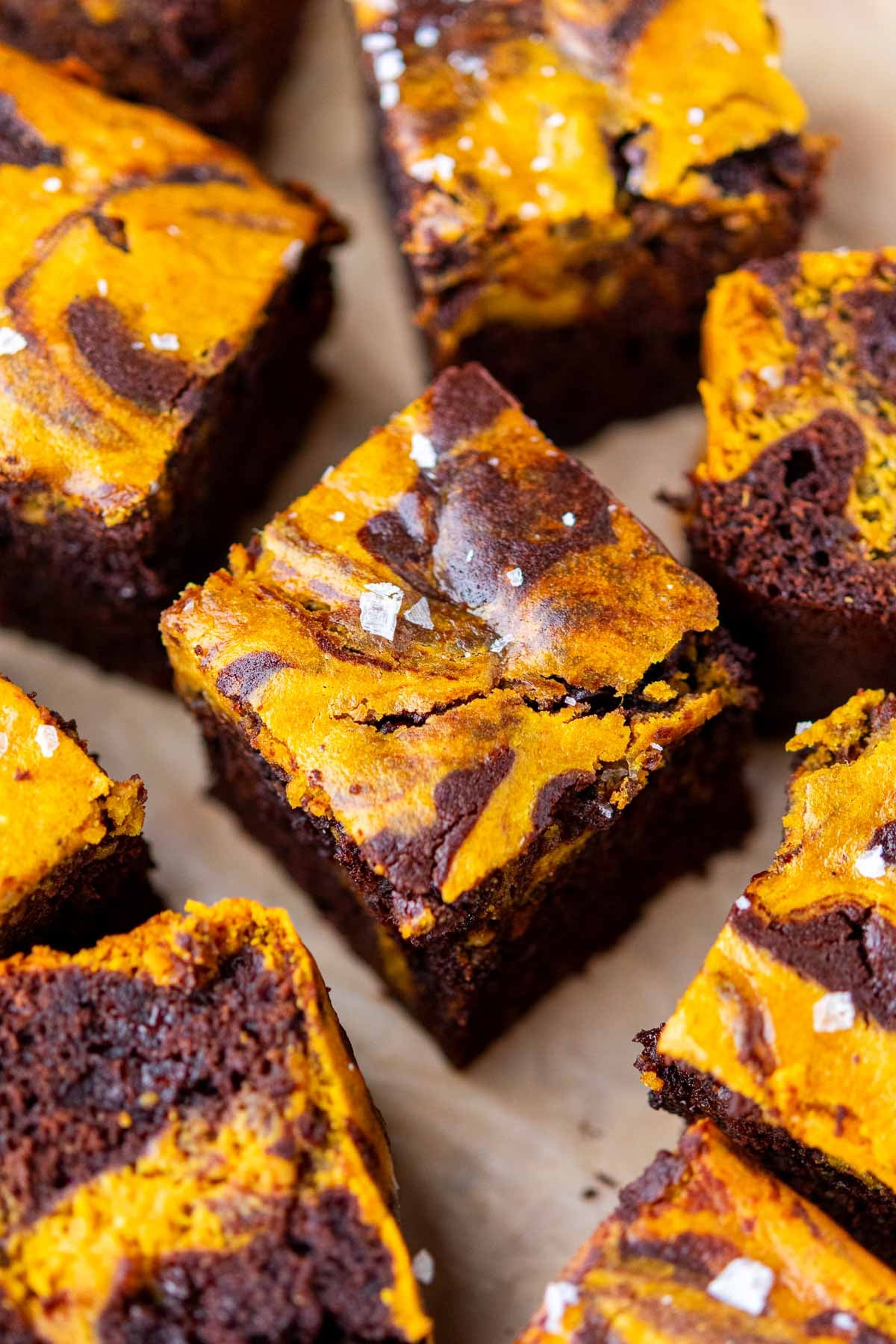 Cool completely on a wire rack before removing the pumpkin brownies from the pan, releasing from the parchment paper, and slicing into 4×4 rows to create 16 bars.