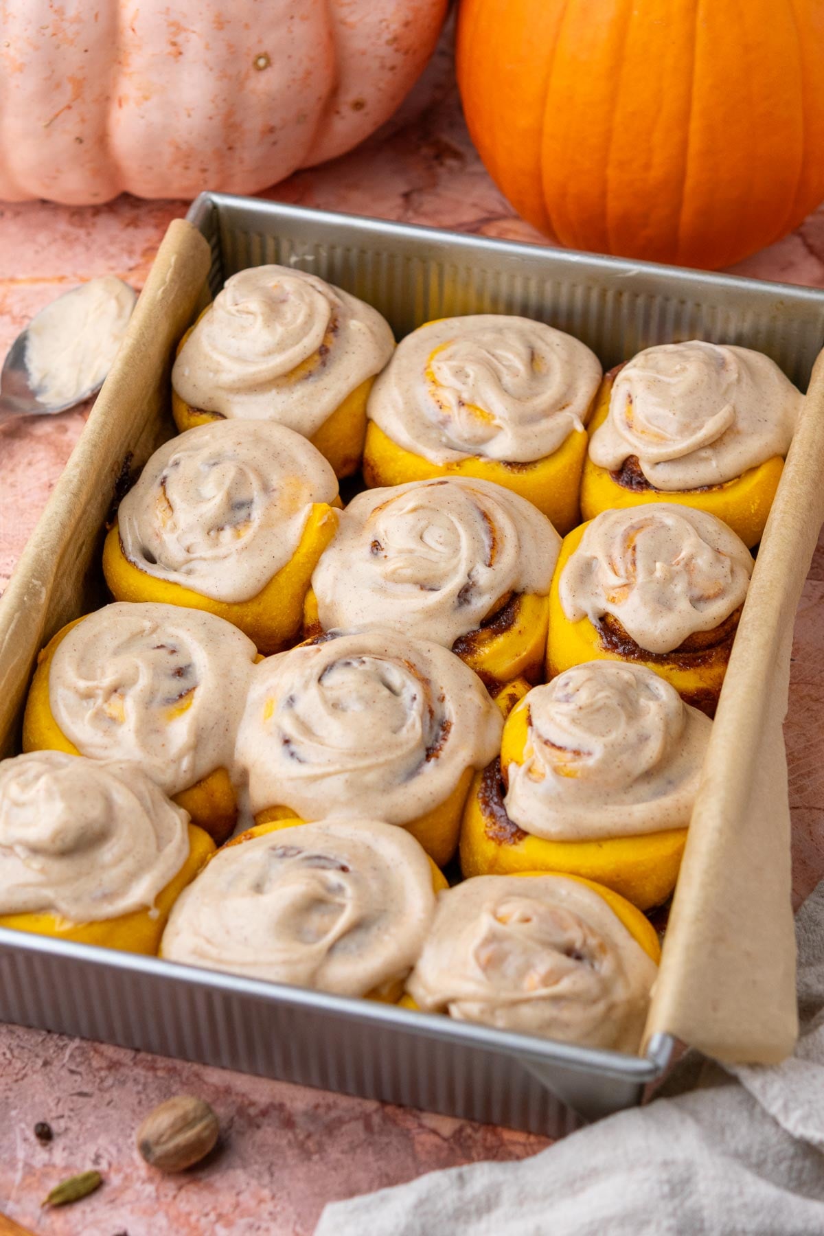 While I think the chai cream cheese frosting pairs perfectly with the pumpkin cinnamon rolls, other frostings or glaze variations would also be fine!